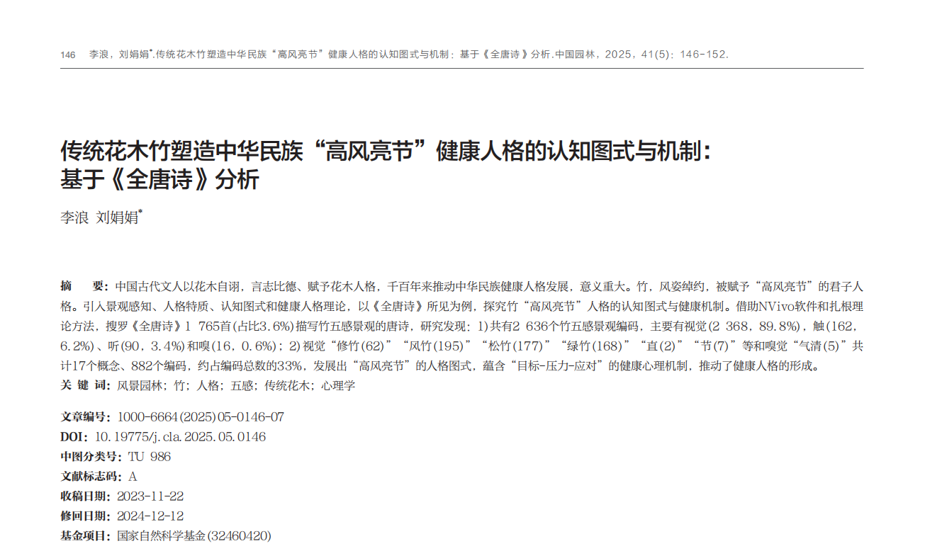 公司风景园林系刘娟娟教授数字化风景园林康养团队于《中国园林》2025年第5期发表研究论文《传统花木竹塑造中华民族“高风亮节”健康人格的认知图式与机制:基于<全唐诗>分析》。该论文创新性地运用健康人格理论,深入研究中国传统园林花木独具特色的康养模式。这项研究为刘娟娟教授提出并首创的“风景园林心理学”方向增添了新的突破。公司2021级风景园林学硕士研究生李浪为第一作者,刘娟娟教授为通讯作者,研究得到了国家自然科学基金《耦合地理空间和历史文本数据的云南边疆名山风景区景观“特征—感知—偏好—认同”研究(32460420)》资助。《中国园林》是风景园林学科的权威期刊,为中文核心期刊、中国科技核心期刊、RCCSE中国核心学术期刊、建筑科学领域高质量科技期刊分级目录(2020年)T1级期刊、中国农林核心期刊、中国科学引文数据库(CSCD)来源期刊和中国人文社会科学来源期刊。
