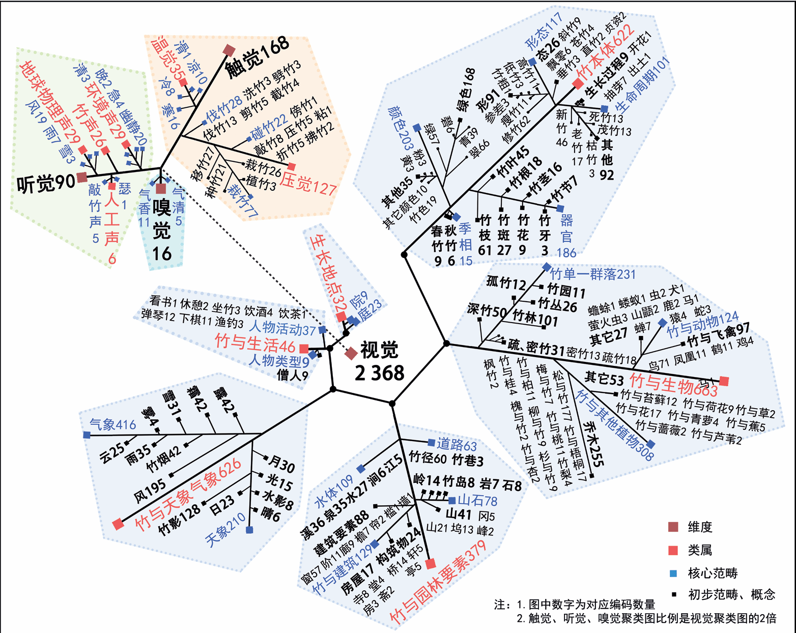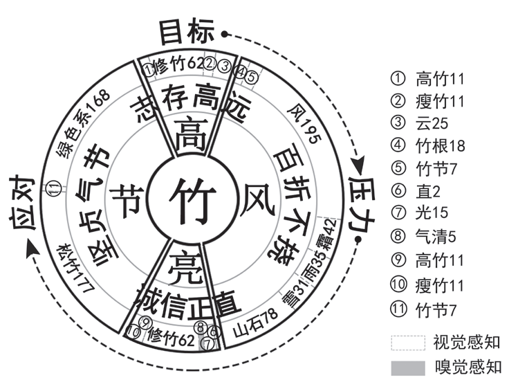 本研究引入景观感知、人格特质、认知图式和健康人格理论,以《全唐诗》所见竹为例,探究竹“高风亮节”人格的认知图式与健康机制。竹,风姿绰约,千百年来积累了丰富的观赏体验和君子比德内涵,是“梅兰竹菊”四君子和“松竹梅”岁寒三友之一,被赋予“高风亮节”的君子人格。可以说,中国文化是“竹的文化”。本文借助NVivo质性分析软件和扎根理论方法,搜罗《全唐诗》中共计1765首(占《全唐诗》总篇目3.6%)竹诗句,探究诗人将竹作为审美对象,赏析竹的颜色、形态等五感景观,并在心理层面诱发“高风亮节”人格审美意趣的认知图式。研究发现:①共有2636个竹五感景观编码,主要有视觉(2368,89.8%),触(162,6.2%)、听(90,3.4%)和嗅(16,0.6%)较少;②视觉“修竹(62)”“风竹(195)”“松竹(177)”“绿竹(168)”“直(2)”“节(7)”等和嗅觉“气清(5)”共计17个概念、882个编码,约占到《全唐诗》竹五感景观编码总数的33%,发展出“高风亮节”人格图式,蕴含“目标-压力-应对”健康心理机制,即树立“高”人生追求目标、做好面对“风霜雨雪”挫折困难的准备、提出“亮节”应对策略,对心理健康有着积极的促进作用。