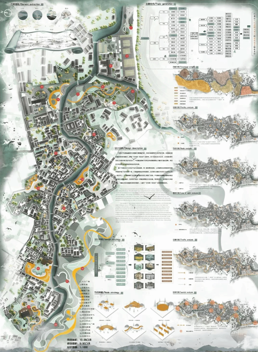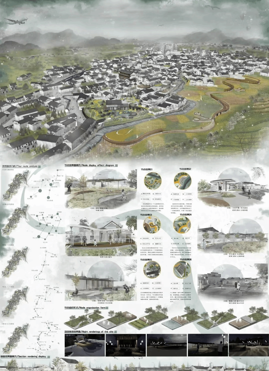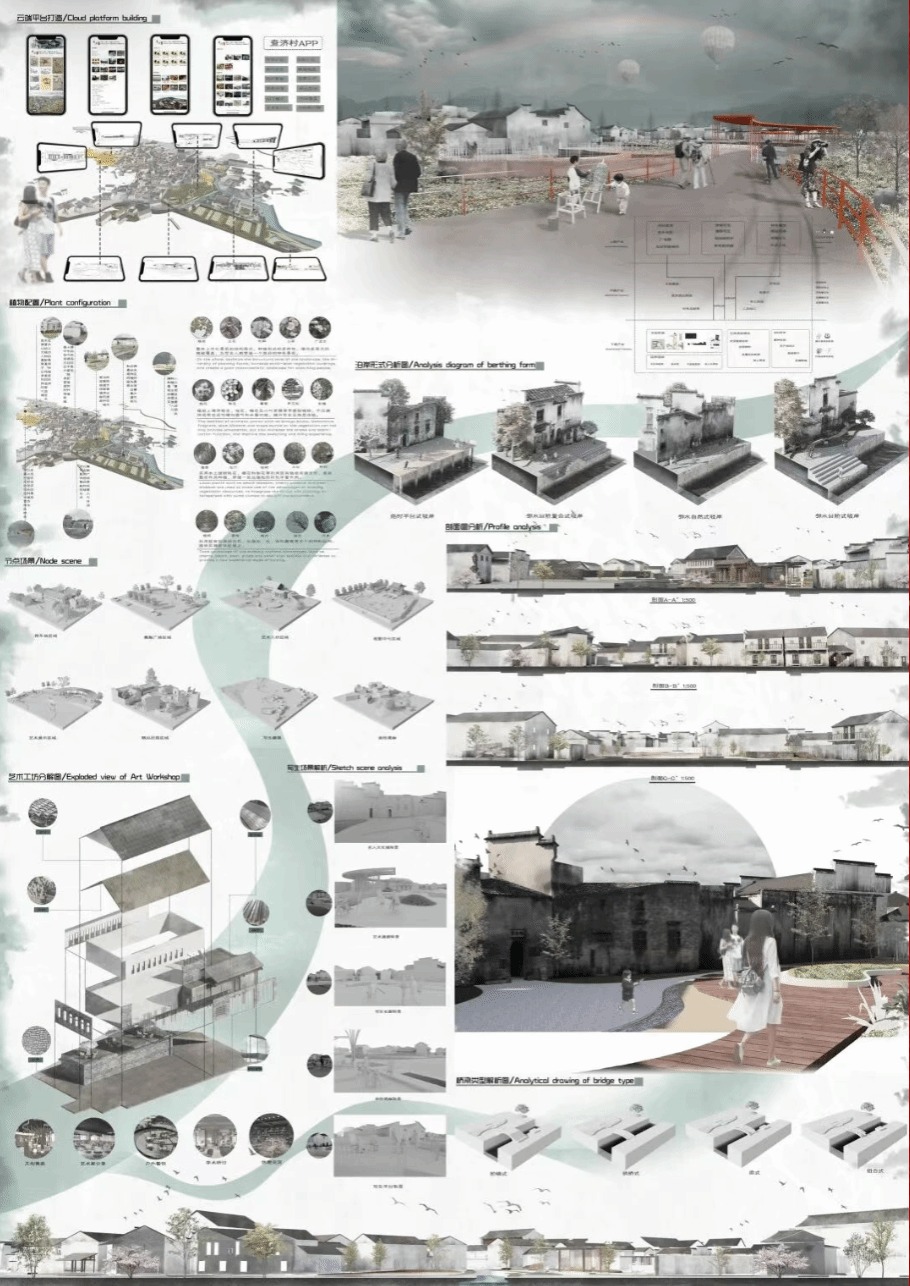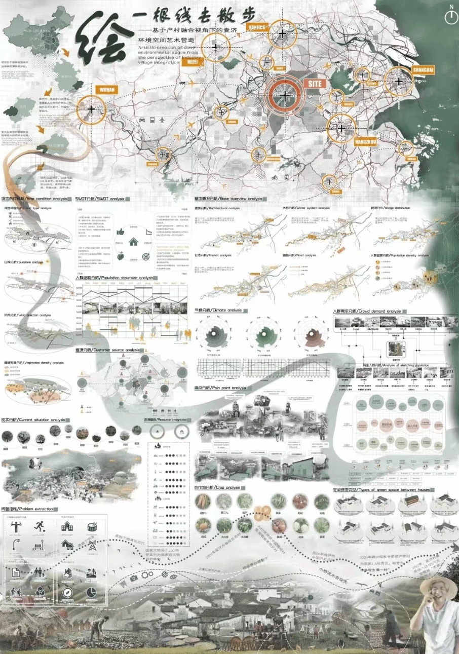 获奖方案《绘一根线去散步》项目地位于安徽省宣城市泾县桃花潭镇查济村,该地拥有悠久的历史文脉,因独特的徽派村落魅力,被誉为“中华第一写生村”。设计地块约为10公顷,共有19处节点设计。整个方案的设计以写生产业为特色品牌,用一根线贯穿全局,让游客真正地感受到查济的世外桃源感,重点打造产村融合视角下的写生特色场景。设计主要思考如何在产村融合发展模式下,用好徽文化、培养徽文化特色产业,查济“中华第一写生村”的品牌知名度。