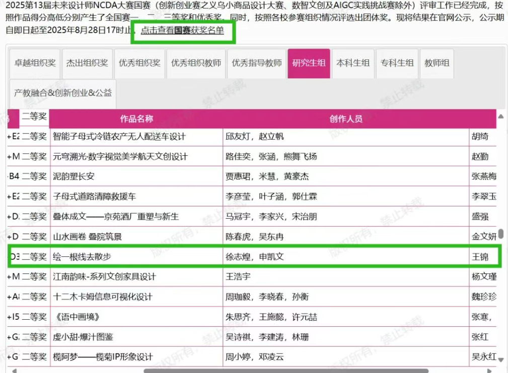 近日,2025年第13届未来设计师·全国高校数字艺术设计大赛(NCDA)全国总决赛获奖名单揭晓。公司师生团队作品《绘一根线去散步》斩获全国二等奖,作品由王锦教授指导,2024级研究生徐志煌、申凯文创作。 未来设计师·全国高校数字艺术设计大赛(NCDA)是入选《全国普通高校学科竞赛排行榜》的国家级A类赛事,由工业和信息化部人才交流中心主办。本届大赛共征集到29万余件作品,竞争激烈。大赛秉承“设计为人民服务,培养未来设计师”的理念,旨在促进艺术与科技融合,鼓励老员工用设计创新赋能社会。
