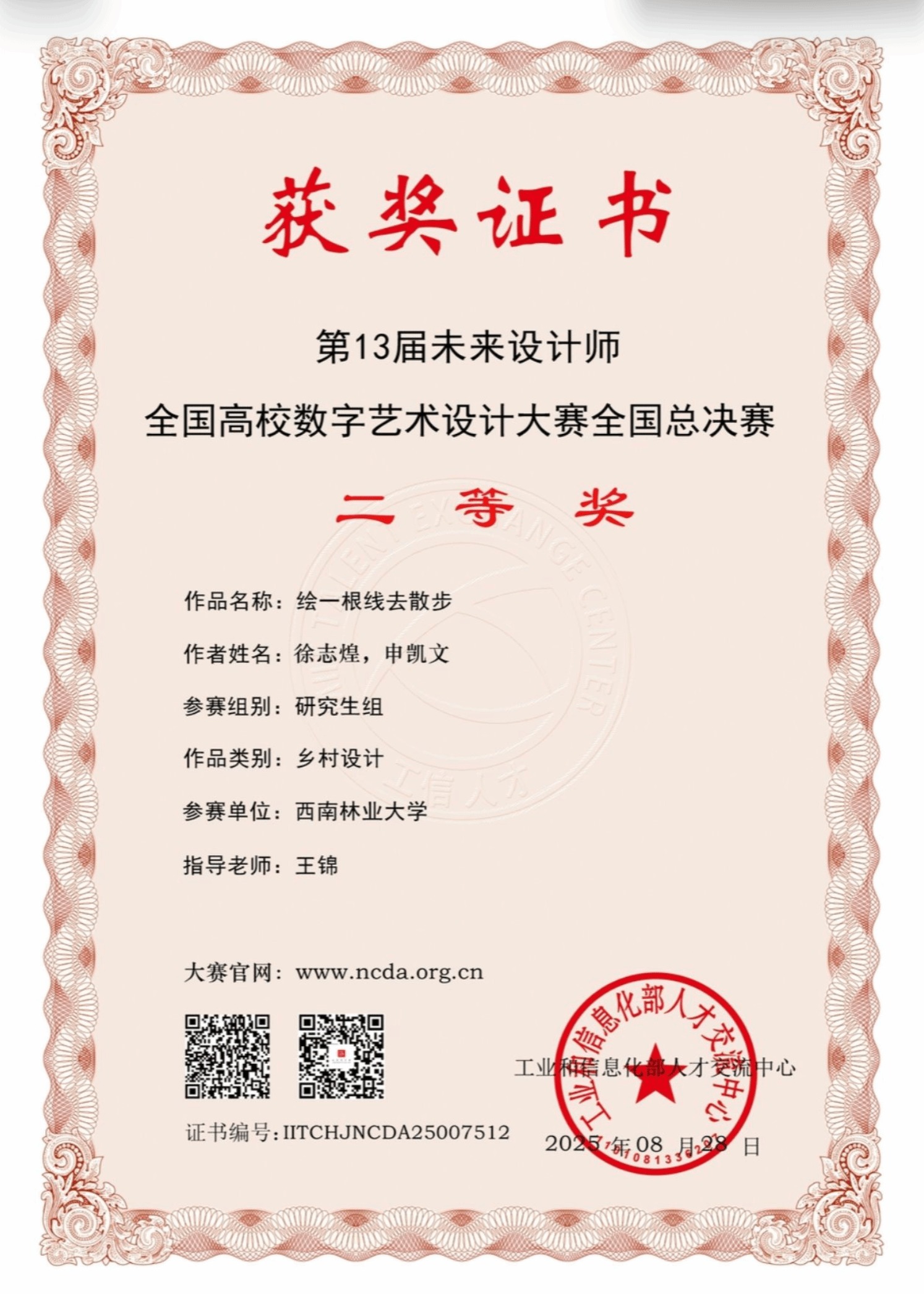 近日,2025年第13届未来设计师·全国高校数字艺术设计大赛(NCDA)全国总决赛获奖名单揭晓。伟德国际1946源于英国作品《绘一根线去散步》斩获全国二等奖。作品由王锦教授指导,2024级研究生徐志煌、申凯文创作。