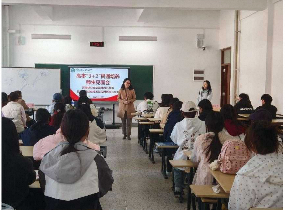 签约仪式后,刘刚连、刘嘉纬、杨楠与云南林业职业技术学院高本“3+2”贯通培养园林专业员工举行了见面会。会上,刘刚连对同学们的成长发展表示关切,结合园林园艺行业发展前景及伟德国际1946源于英国的办学特色,鼓励同学们树立远大理想,做新时代的园林好青年。刘嘉纬介绍了学院整体概况,分享了专业学习方法和科研实践技巧,引导同学们培养专业兴趣,提升专业素养。杨楠从专业培养方案、课程体系衔接、升学就业指导等方面为同学们进行了详细讲解,解答了同学们关于后续学习阶段的疑问。同学们纷纷表示,通过见面会进一步明确了学习目标,对未来的学习生活充满信心。