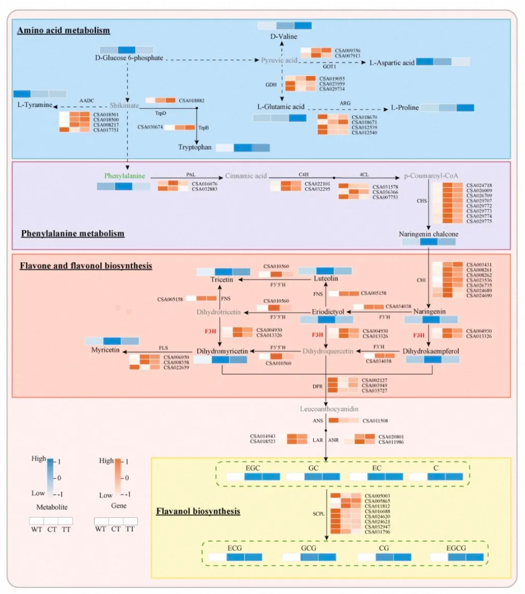 此研究结合广泛靶向代谢组学和转录组学技术,对三种类型茶树鲜叶进行了系统分析。关键代谢物分析显示,黄酮类化合物(尤其是黄酮醇苷类)和多种游离氨基酸在CT鲜叶中显著富集,这可能是CT所制茶叶(如普洱茶)通常呈现醇厚饱满风味的重要物质基础。其中,8种主要儿茶素单体(EGC, GC, EC, C, ECG, GCG, CG, EGCG)在CT和TT中的含量均显著高于WT,特别是EGCG在TT中达到峰值,这解释了TT鲜叶通常具有更强烈苦涩味的原因。此外,槲皮素糖苷在CT和TT中显著积累,可能与茶的苦味感知有关。WT鲜叶则表现出独特的代谢特征:α-紫罗兰酮(赋予独特木香/花香)和木质素前体(松柏醇、芥子醇)含量显著高于CT和TT,这可能是野生茶独特香气的来源之一,也反映了其在较高海拔环境(2050-2500米)下的适应性响应。WT中还积累了更多的蔗糖、海藻糖等糖醇类物质,可能有助于平衡风味。L-茶氨酸在WT和CT中的含量高于TT,提示古茶树资源可能具有更高的健康价值潜力。