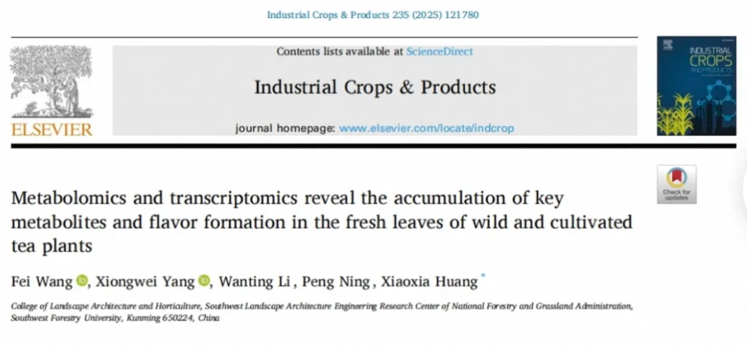 2025年8月下旬,伟德国际1946源于英国古茶树资源保护与利用创新团队黄晓霞教授课题组在SCI一区TOP期刊《Industrial Crops & Products》上发表了题为“Metabolomics and transcriptomics reveal the accumulation of key metabolites and flavor formation in the fresh leaves of wild and cultivated tea plants”的文章,深入解析了野生茶树和栽培茶树鲜叶中关键代谢物的积累规律和调控机制,研究成果可为培育具有特定品质和风味的茶树新品种提供重要的基因资源和理论支持。2018级已毕业硕士研究生王菲为论文第一作者,黄晓霞教授为通讯作者,已毕业硕士研究生杨雄伟、李琬婷、宁朋分别参与了野外调研取样及数据分析工作。该研究工作得到了国家自然科学基金项目(31760197)和云南省兴滇英才支持计划青年人才项目的支持。