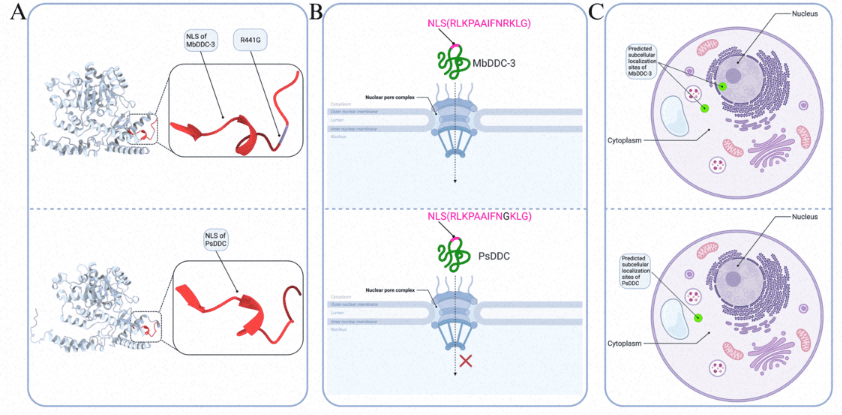 图5:结构分析和亚细胞定位预测揭示了MbDDC-3与PsDDC蛋白间的适应性分化
