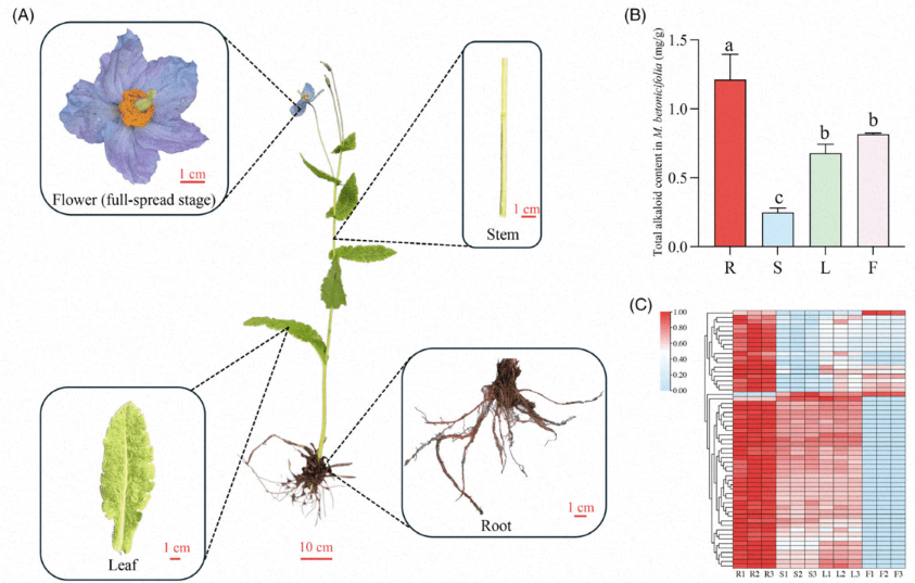 图1A:M.betonicifolia植株及各器官形态;图1B:根中生物碱总量显著高于其他组织;图1C:57种异喹啉类生物碱在根中富集热图