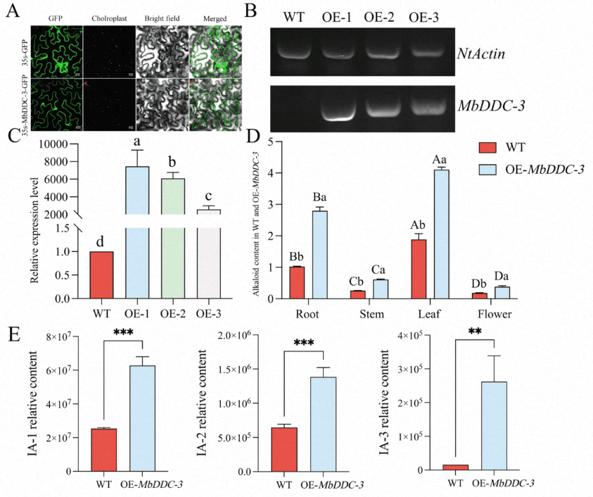 图4A:MbDDC-3亚细胞定位分析;图4B:半定量分析;图4C:MbDDC-3在野生型及转基因型烟草中的表达量分析;图4D:野生型及转基因型烟草各组织部位生物碱含量:图4E:相关代谢物在转基因烟草中的含量变化