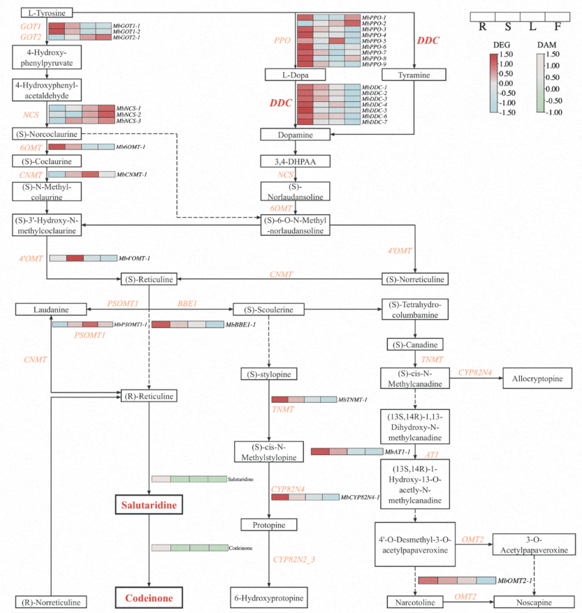 图2:异喹啉生物碱合成通路中DEG的表达模式与DAM的积累模式