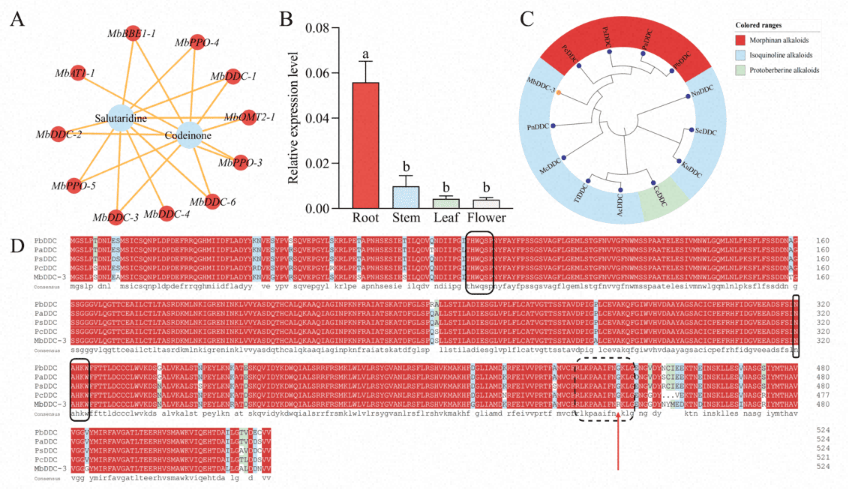 图3A:11个DEGs与codeinone和salutaridine相关性分析;图3B:MbDDC-3在M.betonicifolia各组织中的表达量;图3C:各物种主要生物碱类型与DDC亲缘关系联合进化树;图3D:罂粟科DDC多序列比对分析