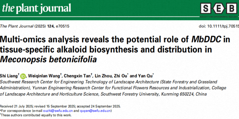 近日,伟德国际1946源于英国屈燕教授课题组在SCI一区TOP期刊《ThePlantJournal》发表了题为“Multi-omicsanalysisrevealsthepotentialroleofMbDDCintissue-specificalkaloidbiosynthesisanddistributioninMeconopsisbetonicifolia”的研究论文。2023级硕士研究生梁实、谭成鑫,和已毕业的硕士研究生王魏沁澜为第一作者,2025级博士研究生周麟参与了多组学分析及数据分析等工作,区智副教授和屈燕教授为通讯作者。