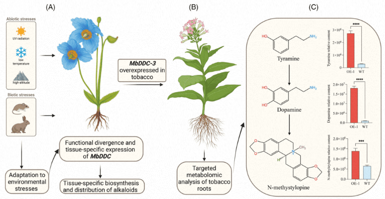 藿香叶绿绒蒿(M.betonicifolia)是青藏高原特有的罂粟科(Papaveraceae)代表性药用植物,长期用于藏医药体系中治疗疼痛、炎症等疾病,其主要活性成分为异喹啉类生物碱(isoquinolinealkaloids),这是一类广泛存在于毛茛科、罂粟科及小檗科植物中的含氮次生代谢物,具有镇痛、抗菌、抗癌等多种药理活性。酪氨酸脱羧酶(Tyrosinedecarboxylase,DDC)是异喹啉类生物碱合成通路中的关键限速酶,催化酪氨酸生成酪胺或多巴胺,为多种生物碱提供前体。阐明其在高原植物中的功能与演化特征,对于理解药用植物的代谢调控与适应性进化具有重要意义。